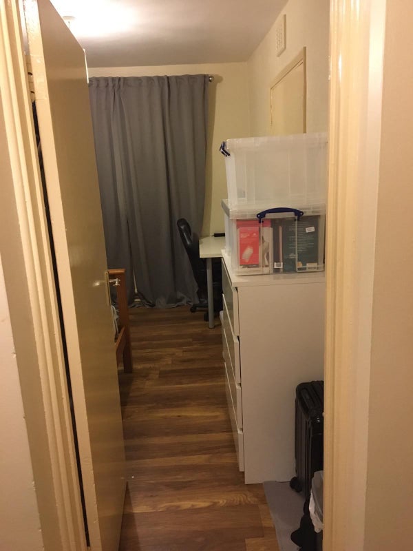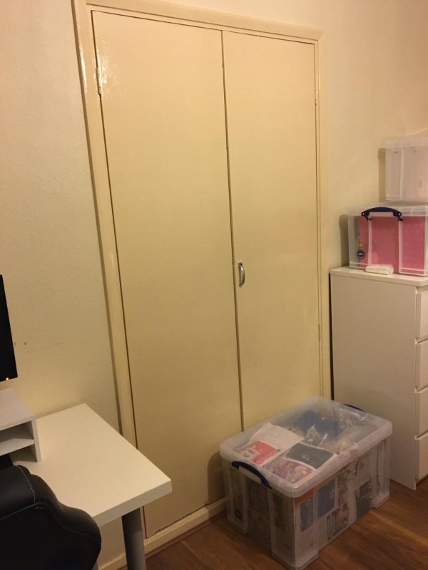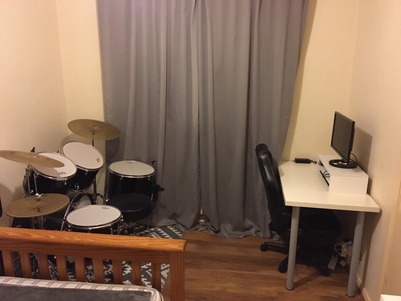 The medium size room comes fully furnished with double bed, built-in wardrobe, desk and chest of drawers.