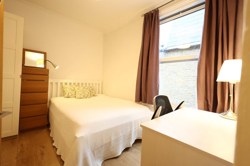 Bedroom available is on the first floor with a large double glazed sash window. It has a double bed, cupboard with shelves and hanging space and tall 6 drawer chests of drawers with mirrored top. There is also a desk, desk chair, bedside light, desk light, mirror and blackout curtains.