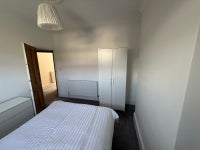 The room includes a double bed, wardrobe, and chest of drawers. There is a separate office room, which has two office chairs (to share with another person), space for two laptops/computer screens, a large whiteboard and a long work desk.