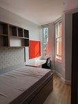 The room is fully furnished with a double bed with under-bed storage, desk, desk chair, desk lamp, wardrobe, shelves and a sink. Quiet corner room with only 1 neighbour.