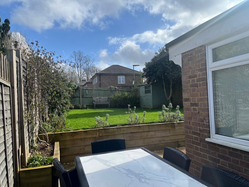 About the property: The house is fully furnished and includes a well-equipped kitchen (including dishwasher, washing machine and tumble dryer), bright and spacious lounge with a large TV (with Netflix, Amazon prime video, Sky Sports and TNT Sports subscriptions), dining area, shared bathroom and a large sunny garden with a large outdoor marble table, chairs and a shed. The room available comes furnished with a double bed, bedside tables, a TV and is completed with a built-in wardrobe. The house is situated on quiet Marlborough Drive, a 10 minute walk from the nearest shops/the centre of Weybridge and a 20 minute walk from the railway station. The house comes with a garage and free parking.