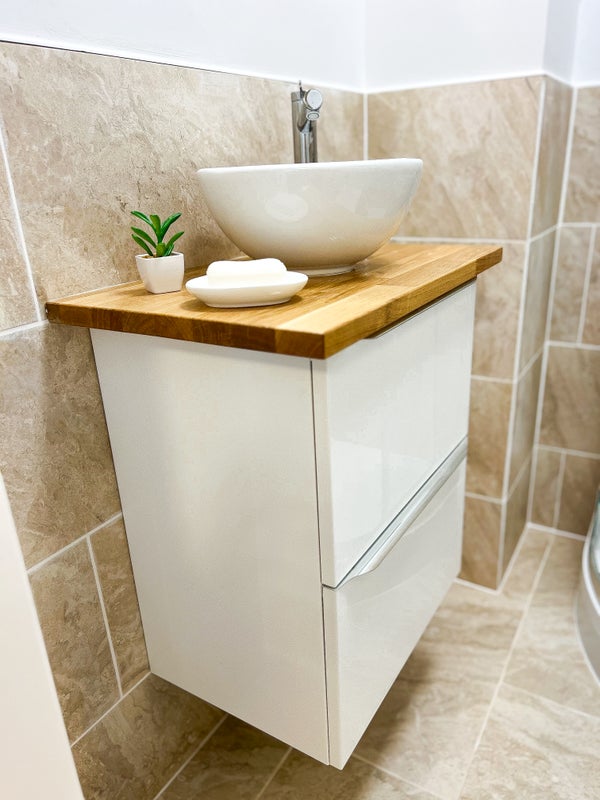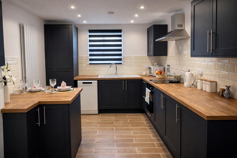 ✔️ Stylish wooden worktops, modern dark cabinets, and quality appliances