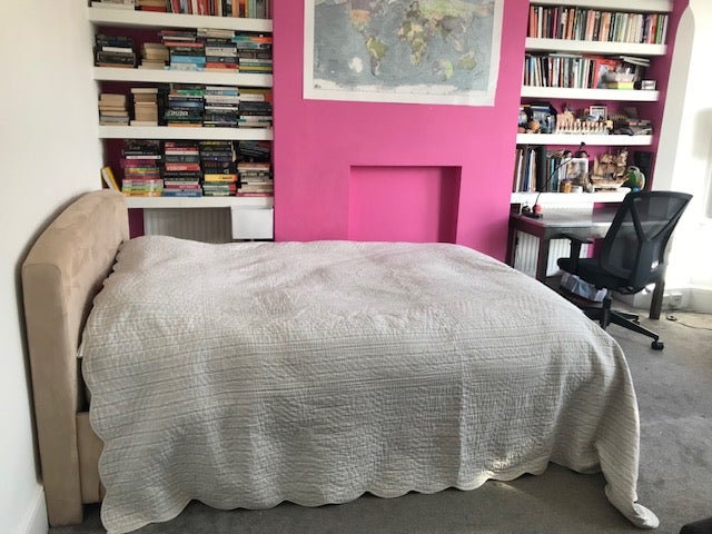 Room includes a king size bed, a large sofa, armchair, chest of drawers, desk and office chair. The room has sole access to a small balcony. Good Wi-Fi connections. (In the pictures the shelves have books on but they can be removed)
