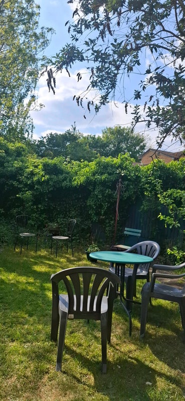 The shared spaces are designed to balance individual comfort with neutrality. Residents have full use of the drawing room, dining room, kitchen, two bathrooms, and two gardens.