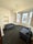 The property features a spacious double bedroom furnished with a double bed and storage, along with a large, naturally bright living room benefitting from bay windows and two sofas. The separate kitchen is well equipped with an oven, hob, fridge-freezer, and ample storage space.