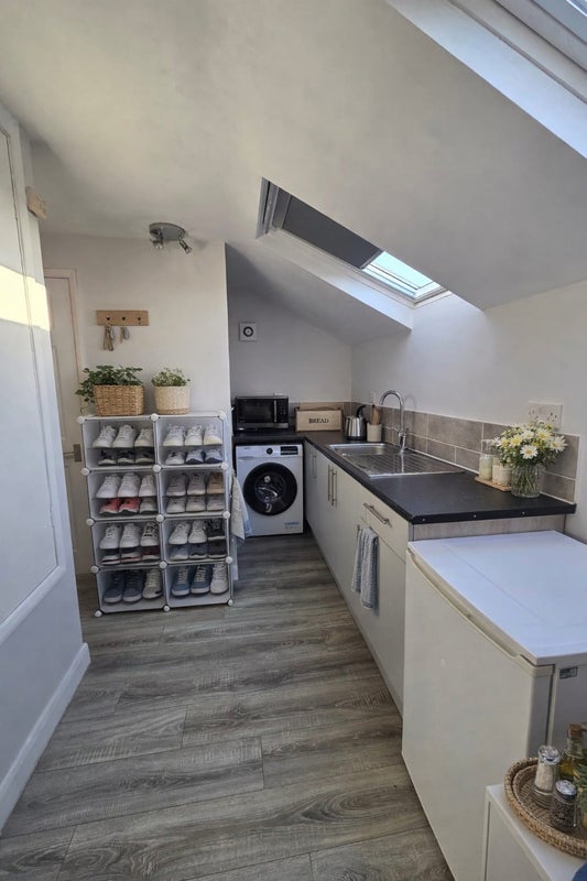 Kitchen includes fridge with freezer compartment, washing machine, hob & combi oven (oven, grill, microwave & air fry)