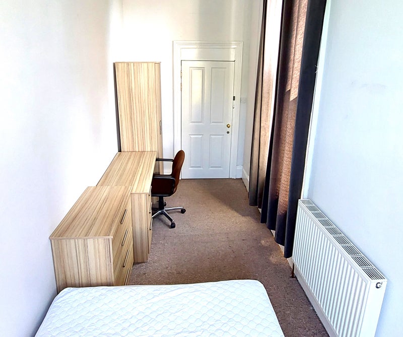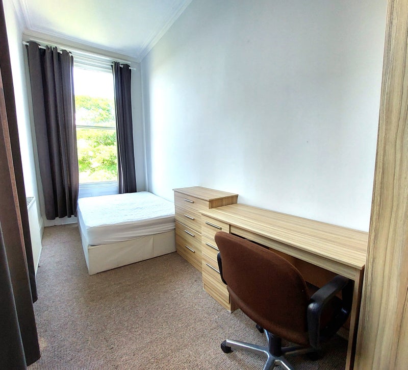 Room 3 - 3.8m x 2.9m first floor. A lovely high-ceiling, large window and a view over the crescent green. The room comes with a double bed, mattress & mattress protector, drawers, bed-side table, desk and wardrobe. There are black-out curtains and a lock on the door.