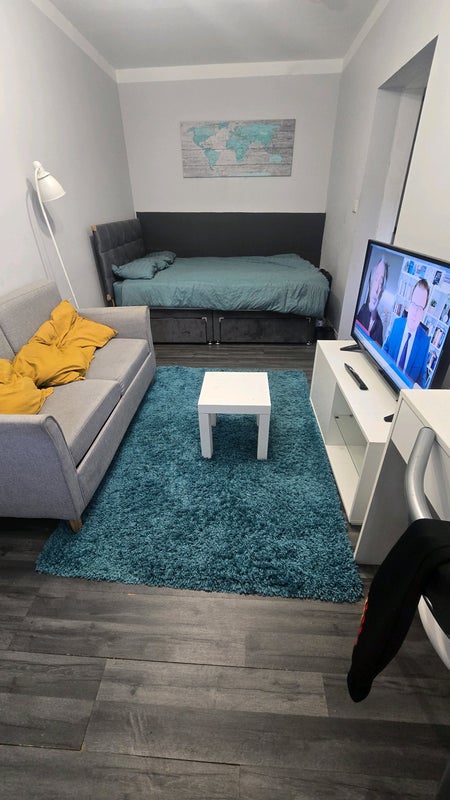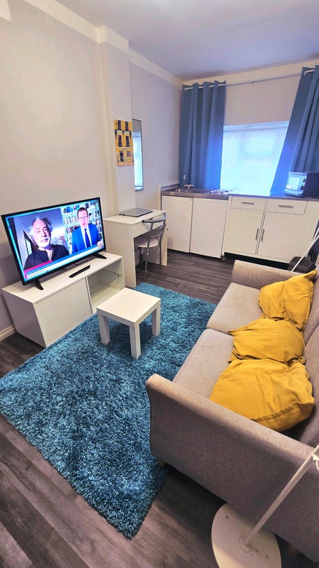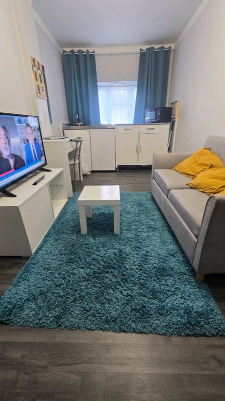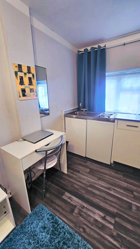 Fully furnished and ready to move in, the studio includes a double bed, workspace, Smart TV, and ultra-fast Virgin Media fibre broadband (1Gb) — perfect for working from home. The kitchenette is equipped with a two-plate stove, fridge, kettle, toaster, and essential kitchenware, plus a combi washing machine/dryer for convenience.