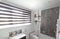 Modern bathroom with shower/bath, w. c, inset basin and towel rail. Window to rear aspect and woodlands.