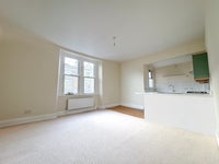 The flat features a spacious open-plan living and kitchen area, flooded with natural light from large sash windows. The new kitchen is neatly arranged and includes ample worktop space, integrated appliances including a dishwasher, and a breakfast bar that opens into the living area, creating a sociable and practical layout. There are two double bedrooms, both carpeted, offering flexibility for use as either 2 bedrooms, or a single bedroom with a home office, or guest room. The contemporary bathroom is brand new and finished to a great standard. It includes a walk-in shower and modern tiling.
