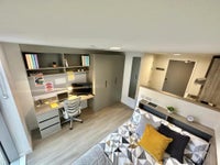 This modern, sleek, large (up to 19.39m2) studio is perfect if you are wanting to get concentrate on your studies and have everything to hand in one place. It comes with a ¾ double bed which incorporates a headboard with clever storage and charging points so you can charge your phone whilst in bed. Each room comes with a wardrobe, shelving, long desk with extended shelving, chair and has a large window which lets in a lot of natural light. Your studio comes with a kitchen, sink, storage, wall cupboards, fridge with freezer compartment and a very cool breakfast bar where you can eat from or chill and have a coffee there in a morning. It also has an en suite with a WC, shower, sink, toilet and accessories.