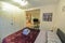 Comfy settee, with dining table and rug.
