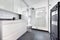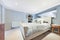 Upstairs is the main living space with exposed wooden floors, double-height ceilings and large floor-to-ceiling windows that bring in fantastic natural light throughout the day. The open-plan kitchen and dining area is fully equipped with a five-burner gas hob, oven and microwave, a kitchen island with stools, and a solid wood dining table that’s great for hosting.