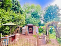 A beautiful wooden porch opens out into a large 18ft yurt, offering its own facilities, including an outdoor kitchen, dining table, shower, compost toilet and fire-pit.