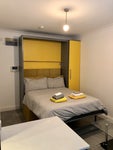 A lovely refurbished one double bed studio flat with integrated kitchen washing machine and fridge freezer. Ensuite shower room. Drop-down Wallbed with fitted wardrobe and storage. table and 2 chairs.