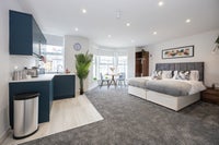 Sand Dune features high ceilings, a large bay window with elevated sea views, and a calm, contemporary layout designed for comfort and practicality.