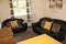 Bright living room with sofas and dining area
