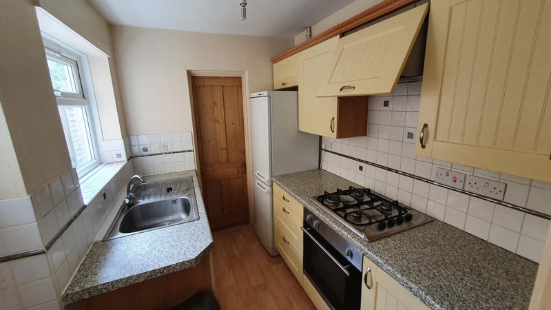 The modern, fully fitted kitchen offers ample storage, a cooker and hob, fridge, freezer and washing machine.