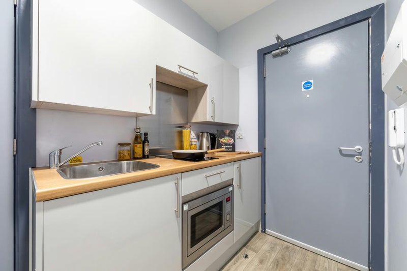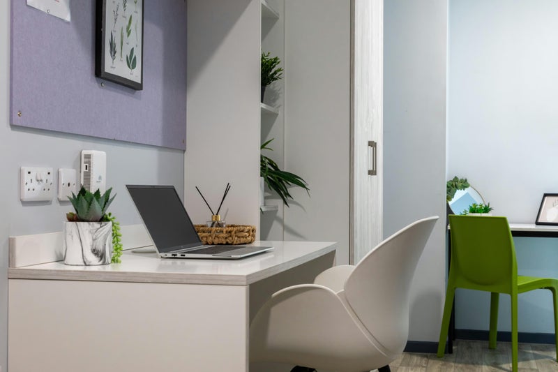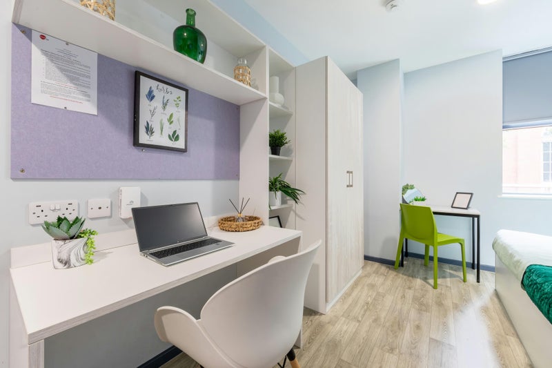 Wardrobe, Desk, Chair, Heater, Hob, kettle, toaster, Microwave, Fridge / Freezer, Sink, Window, Laundry, ironing board, bins