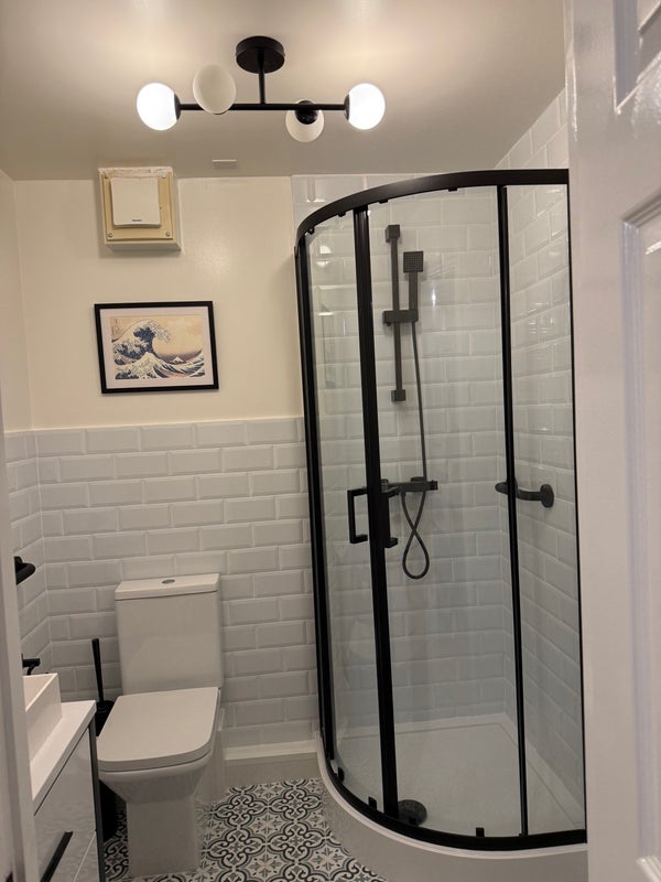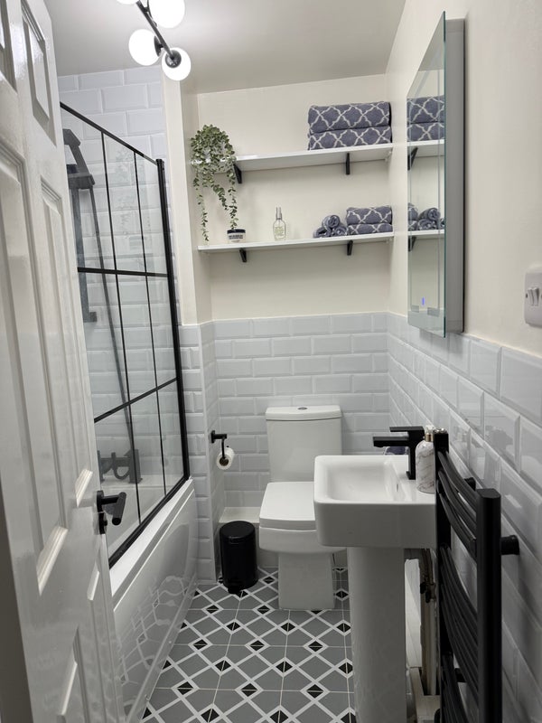 🛁 Main bathroom: tiled floor, bath with overhead shower, toilet, sink, and heated towel rail