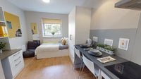 • The studio flat is furnished with a small double bed, a desk area complete with bookshelves, a chair, and a wardrobe.