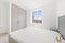 Floor to ceiling glass doors open onto a private balcony overlooking the beautifully landscaped communal garden courtyard, enhancing the sense of light and space within the apartment.