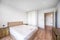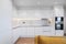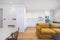 The open plan kitchen features sleek recessed handles, Silestone quartz worktops and a porcelain sink, plus an integrated Bosch oven with induction hob, microwave, fridge-freezer and dishwasher. Cabinetry in a warm eggshell nods to the apartment’s natural palette, while the tiled splashback adds a gentle lustre. To optimise storage in the kitchen, a utility space with a washing machine is discreetly housed behind closed doors in the corridor.