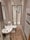 The property includes a sleek modern bathroom with walk-in shower cubicle, white suite, heated towel rail, and mirrored storage cabinet. Additional features include a hallway utility area with washing machine provided, electric heating with wall-mounted radiators, and window blinds throughout.