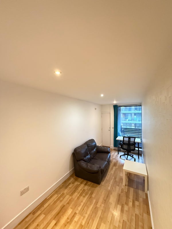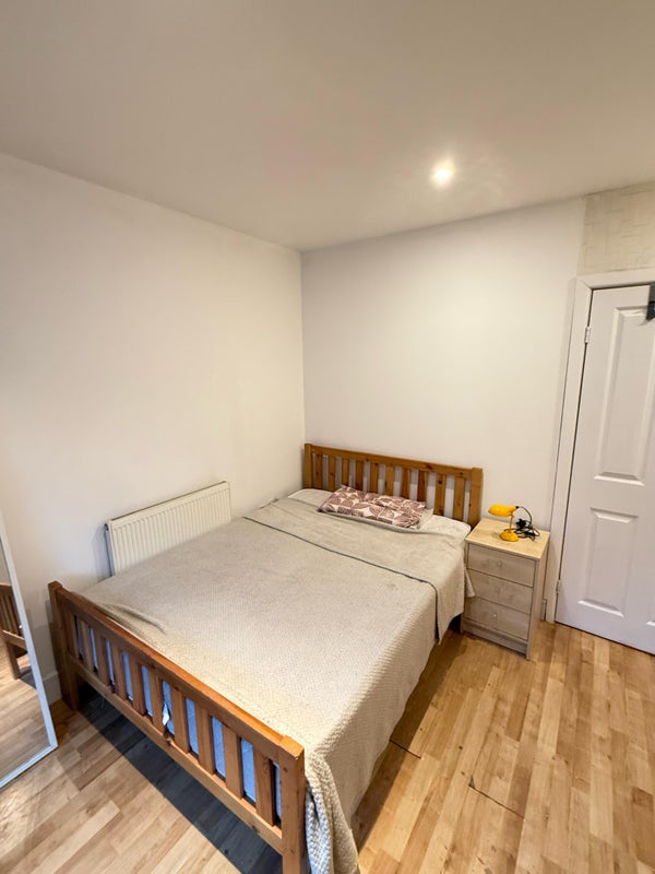 The room is fully furnished with a wardrobe, chest of draws, double bed with orthopaedic mattress, desk and desk lamp.