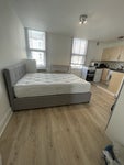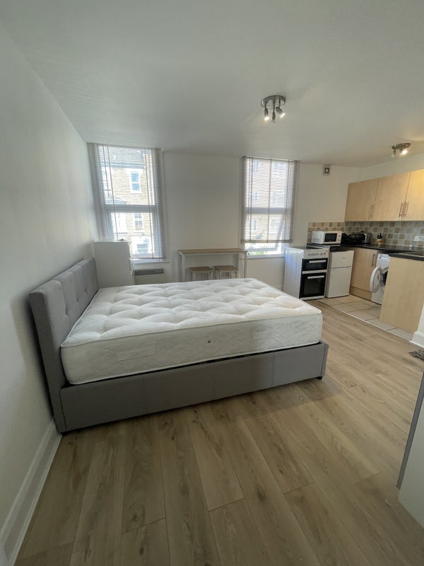 The open plan living - kitchen is bright and spacious. The studio is of a really good size, has wooden laminated flooring , a double bed, chest of drawer and a big wardrobe with mirrors. The kitchen has a small fridge freezer, oven and a washing machine. It is ideal for a a single person ( professional ) or a couple.