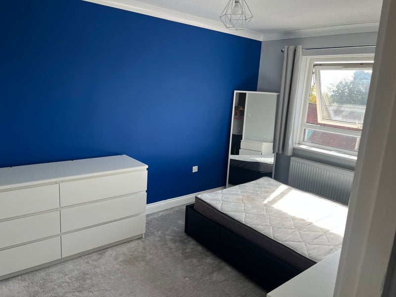A spacious double room is available in a three-bedroom flat. The room contains a double chest of drawers, a build in wardrobe and a double bed with storage underneath.