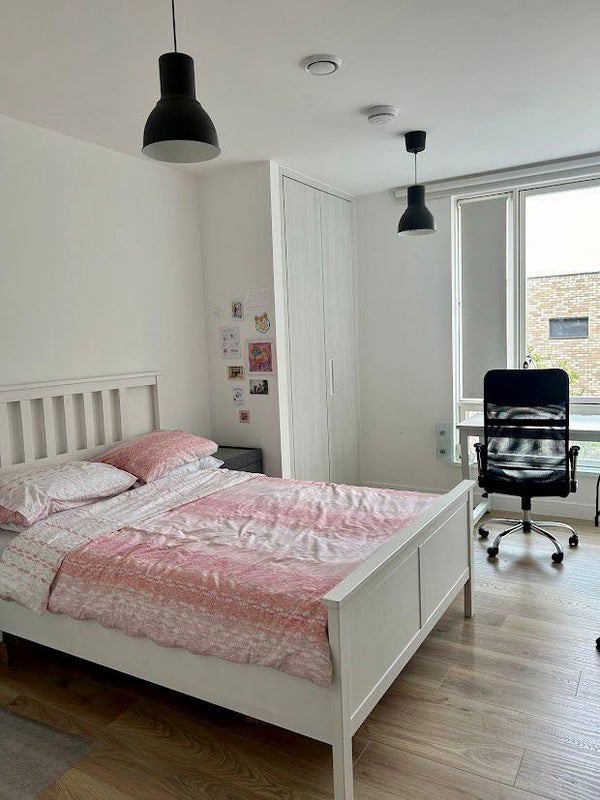 Room: A double en-suite (shower) bedroom furnished with a double bed (frame & mattress), desk, inbuilt cupboard and a separate chest of drawers. The room gets great natural light and has a big window with views out to the courtyard.