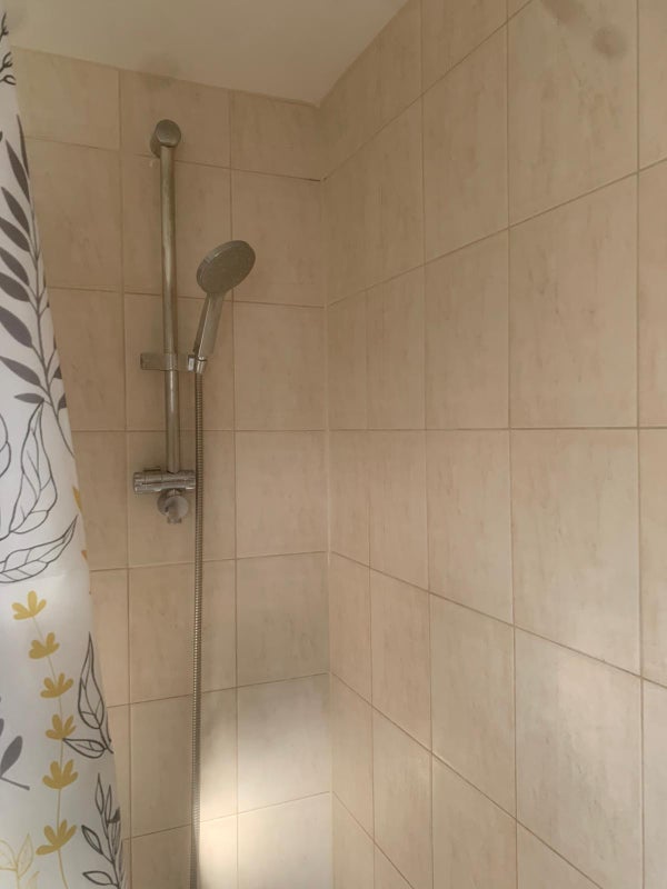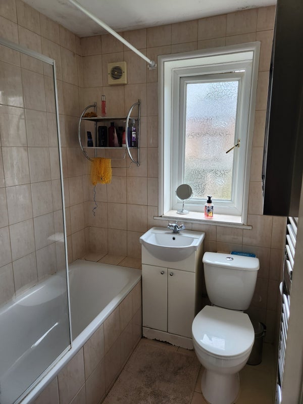 The Bathroom has a bath with shower attachment, toilet, sink, bath shelves and mirrored cabinet.