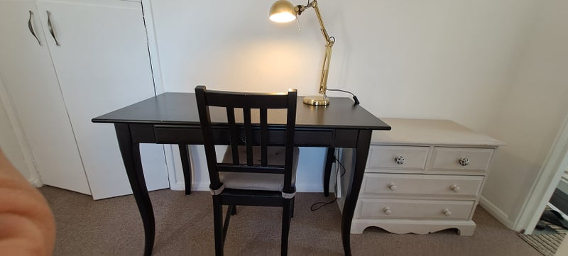 Double bed (140 cm) with orthopaedic mattress, writing desk, chair, chest of drawers x 3 and wardrobe with hanging space for clothes.